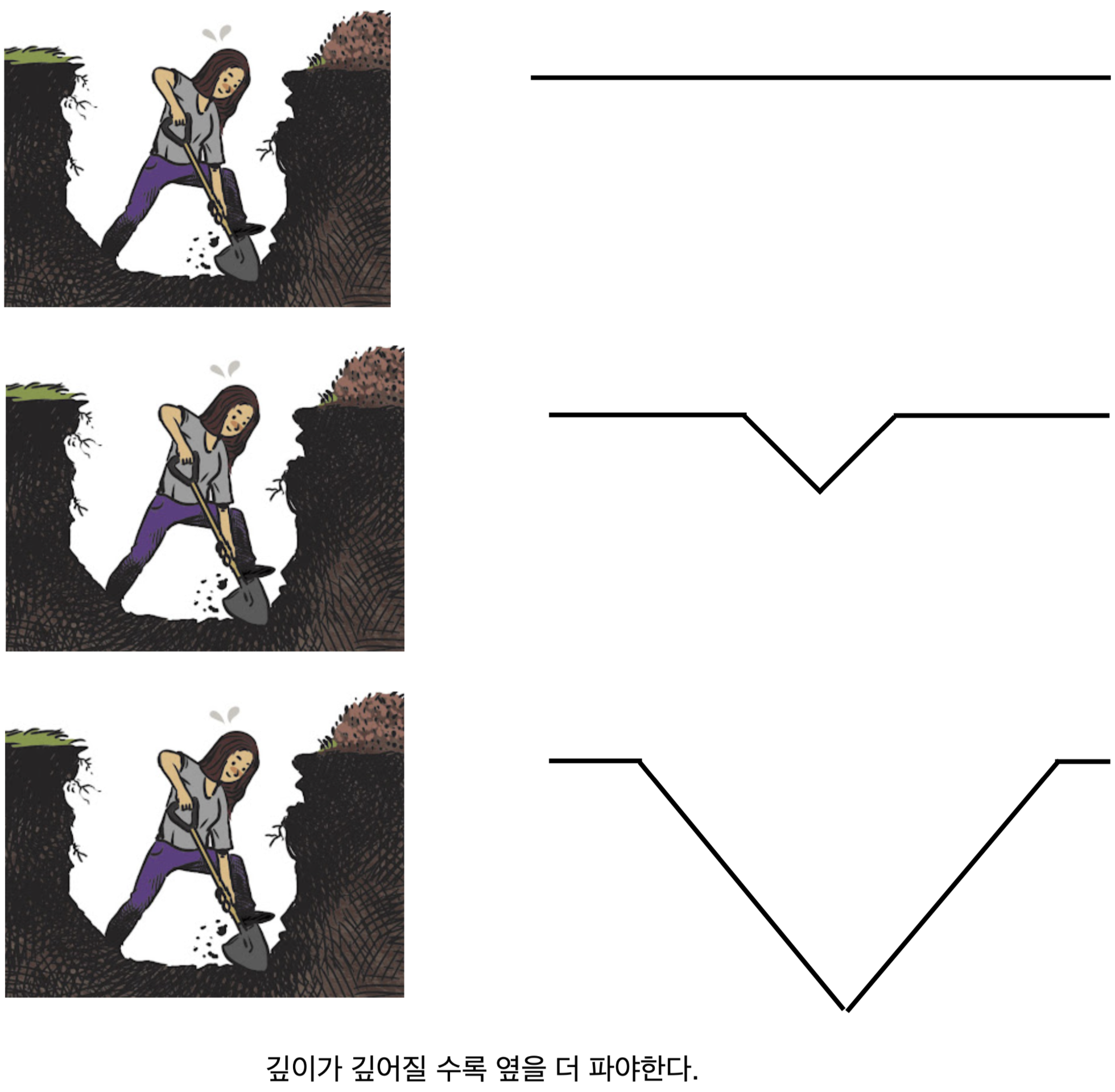 역시나 이번에도 조직원들이 파놓은 우물은 너무나 깊어 보였어요. 이러한 고민을 새로운 리더에게 공유하니 다음 얘기를 해주셨어요. "남들이 깊게 파놓은 우물은 한 번에 판 게 아니에요, 절대 그렇게 팔 수 없어요. 깊이가 깊어지려면 옆을 더 파야해요."
