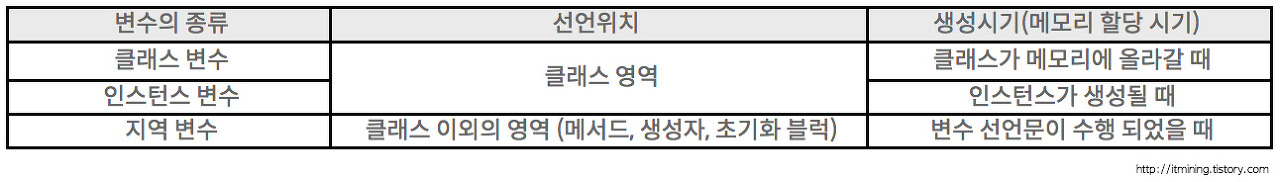 자바에서의 변수는 클래스 변수, 인스턴스 변수, 지역 변수가 있습니다. 변수의 종류를 결정짓는 것은 '변수가 선언된 위치' 입니다.